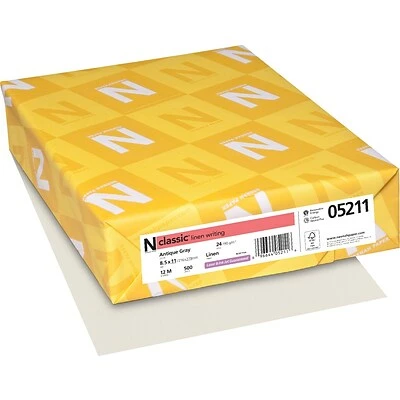 Neenah Paper Classic® Linen writing paper in antique gray color measures 8 1/2″ x 11″ and is acid/lignin free for long-lasting documents. Paper is ideal for letterheads, proposals or communication, sold as 500 sheets per ream.