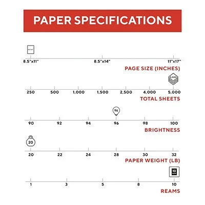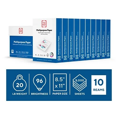 Stock up on this white printer paper that is specifically made for color printing. The 96 brightness rating delivers crisp color images and text, while the 20 lbs. paper weight is engineered to prevent jamming in your copiers and printers. Use this letter-size paper for everything from internal correspondence to presentations. Including 5000 sheets in the package, this Tru Red 8.5″ x 11″ white, color printer paper is ideal for printing both black and white and color.
